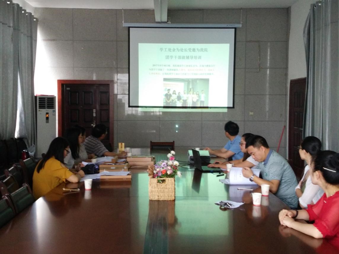 2017年06月20日9点,学工处处长余为,心理咨询中心谢四元等检查组,来KY官网对“全馨全艺”特色成长辅导室进行中期检查。KY官网党总支书记谢光绎、副书记易俊和全体辅导员老师参与会议。
