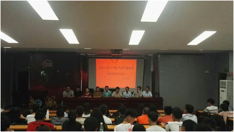919日晚七点半,美术与设计学院书法学教研室举行2017级师生见面会。出席本次会议的有美术与设计学院党总支书记谢光绎书记,党总支副书记易俊副书记,书法教研室全体老师及2017级书法学全体学生。