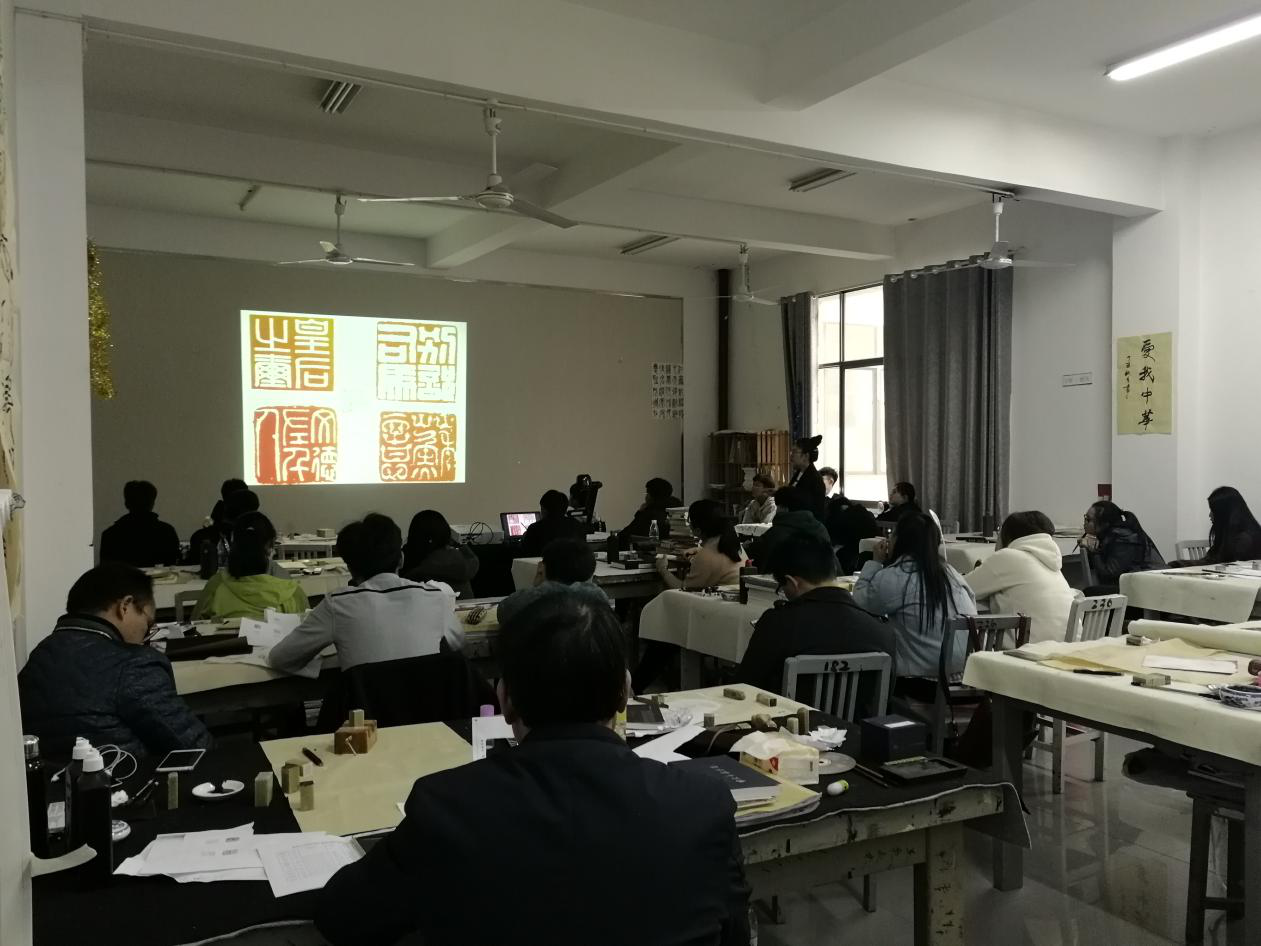 11月11日、15日,欧阳波、钟霖汐两位老师分别在逸夫楼206教室、201教室讲授了院级公开课《篆刻入门及技法》、教研室级公开课《篆刻艺术的形式美》。欧阳波老师讲解了篆刻课程所必备的工具和材料、篆刻临摹的过程以及需要注意的要点。教学内容丰富,逻辑性强,讲授语言形象、生动,与学生互动灵活。钟霖汐老师基于篆刻形式美学的研究进行篆刻技法理论的讲授,分析了篆刻形式中的点、线、面、朱、白等形式要素,教态大方、语言清晰流畅。