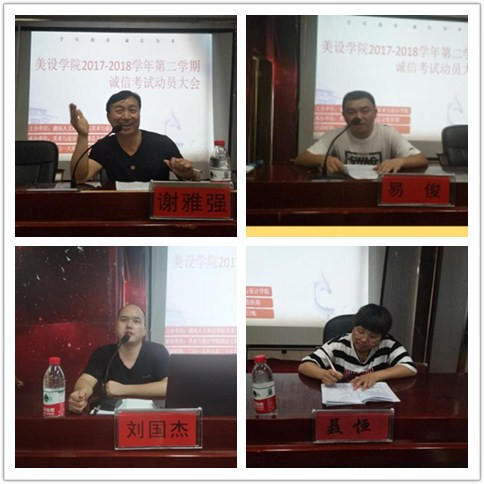 为帮助学生树立诚信考试意识,营造良好期末考试氛围,进一步加强KY官网考风考纪建设,6月27日晚,学院在逸美楼报告厅举行了“美设学院2017-2018学年第二学期诚信考试动员大会”,学院分管教学工作的副院长谢雅强、党总支副书记易俊、团总支书记刘国杰、学工办主任聂恒和全体大一同学参加了本次会议。会议由刘国杰主持。