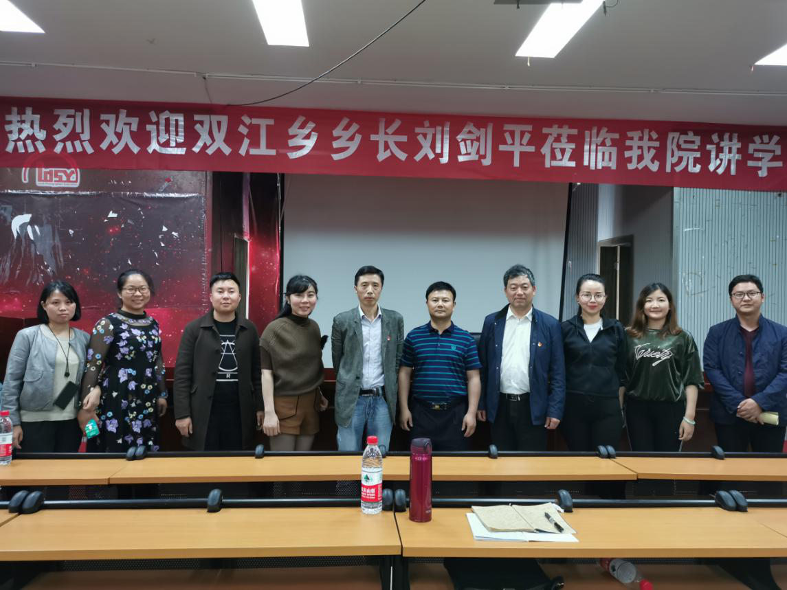 5月14日晚7点30分,美术与设计学院邀请娄底市娄星区双江乡党委副书记、乡长刘剑平来校给环境设计专业师生做了一堂《乡村振兴战略下双江乡的建设与思考》主题报告。美设学院党政领导谢光绎、陆序彦,环境设计专业全体专业教师以及16级、17级 、18级同学参加报告会,会议由陆序彦主持。