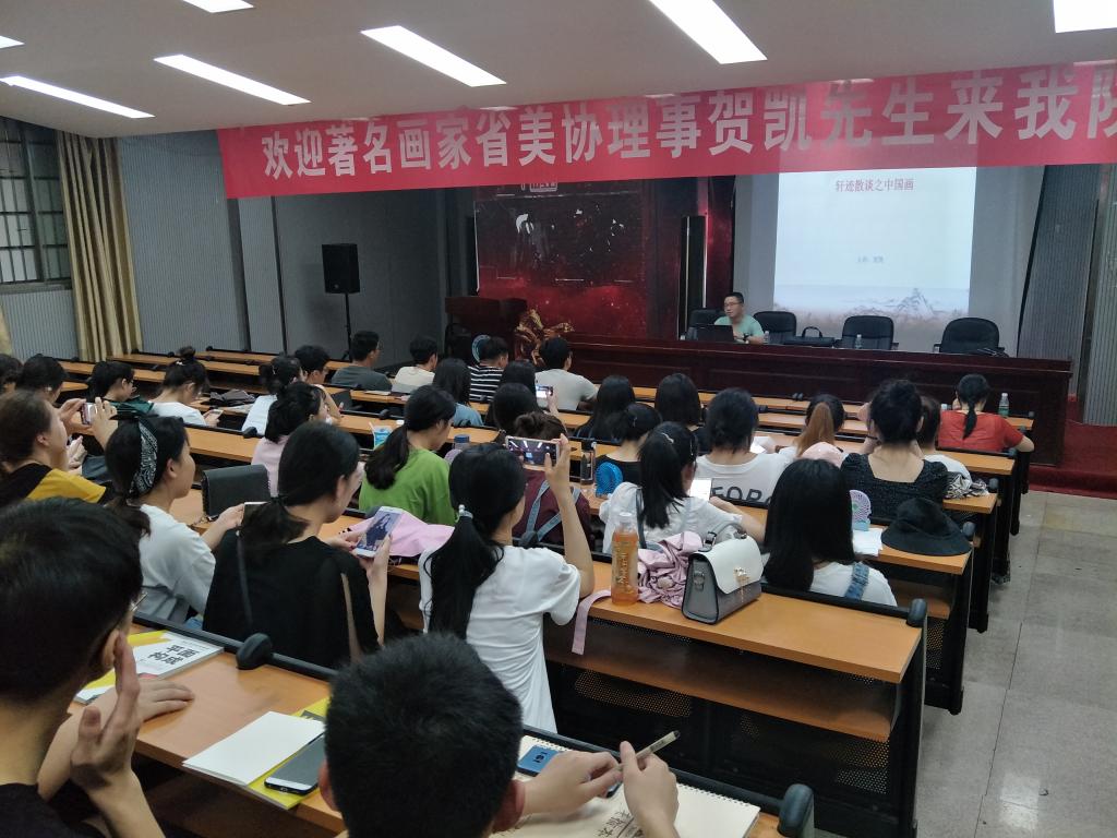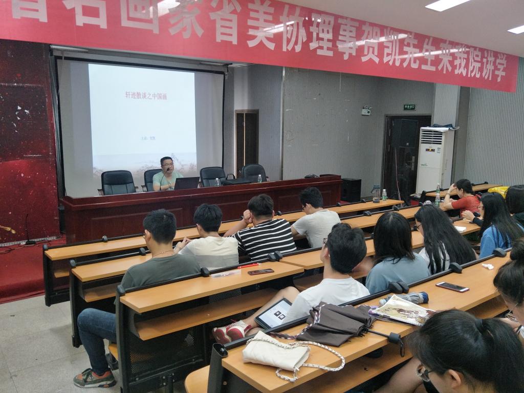6月20日下午,湖南省美协理事,娄底市美术家协会秘书长贺凯应邀来KY官网讲学,美术学专业16级、17级、18级全体同学聆听了讲座。讲座由美术学教研室主任蒋秀召主持。