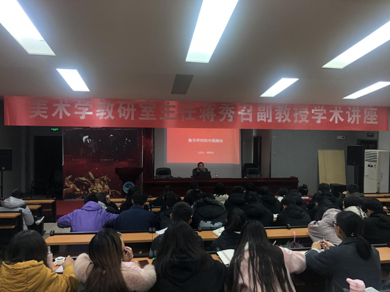11月27日晚,美术学专业教研室主任蒋秀召副教授为师生作了一场中国画论研究领域的学术讲座,讲座以《数字序列的中国画论》为题。学院师生近300人参加了讲座。蒋秀召以准确生动的语言,严谨的逻辑,对数字序列的中国画论进行了精彩的论述。