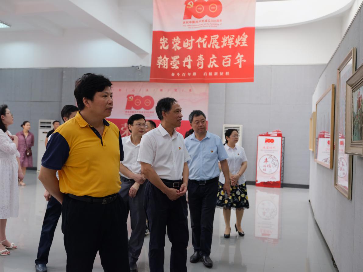 6月28日上午,校党委书记刘和云、校长刘铁铭、党委副书记李军林等全体在家校领导在党政办、宣传部等部门主要负责人以及美设学院党政领导的陪同下,一起来到逸美楼二楼展厅参观展览。