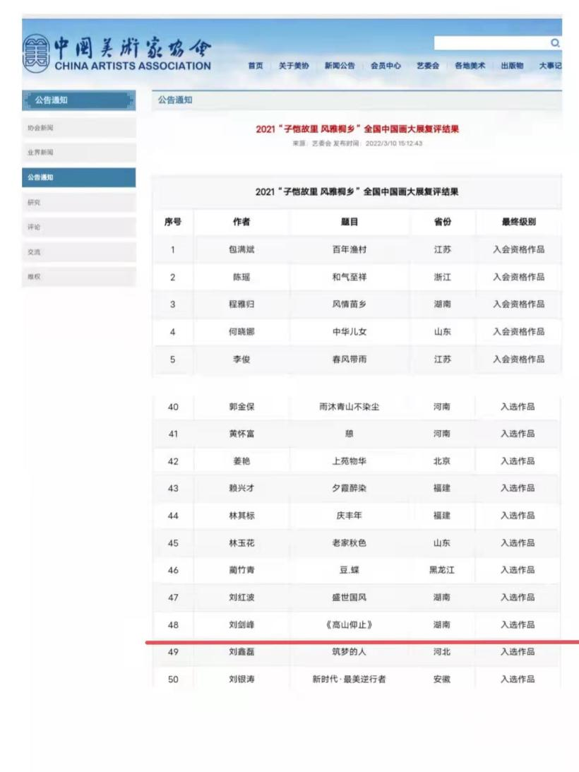 2021年11月,作品《清风徐来祝融峰》入选2021“南岳衡山——首届全国中国画双年展”;