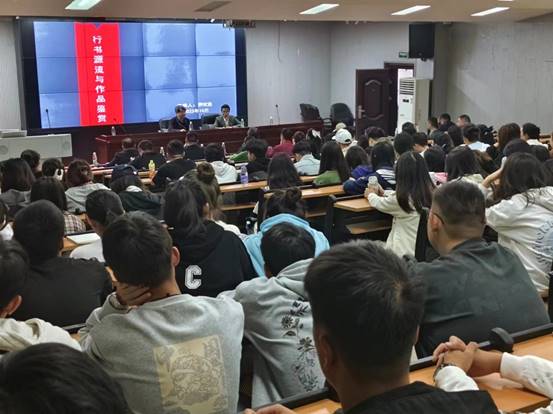 首先,罗红胜由行书的概念引入,从艺术和实用两方面指出了学习行书的意义,并勉励学生要认真对待行书,学好行书。接着,罗教授给大家介绍了行书的分类,还结合自身的经验,详细讲解了学习行书的轨程,特别引用明末清初书法理论家倪后瞻关于学书功夫的三段论,指出学习过程中不同阶段的侧重点及注意事项。接着,罗红胜系统回顾了行书发展演变史,从汉末魏晋质朴的早期行书,到晚清书家寻求新的行书风格突破,娓娓道来,如数家珍。他详细剖析并呈现了王羲之、王献之、王珣、欧阳询、李邕、颜真卿、杨凝式、苏轼、米芾、黄庭坚、赵孟頫、董其昌、何绍基、康有为等行书大家各自鲜明的风格特征。在此基础上,他以《兰亭序》为例,着重跟大家分享了这件尽善尽美之作在笔法、结字、章法等方面的无穷奥妙。