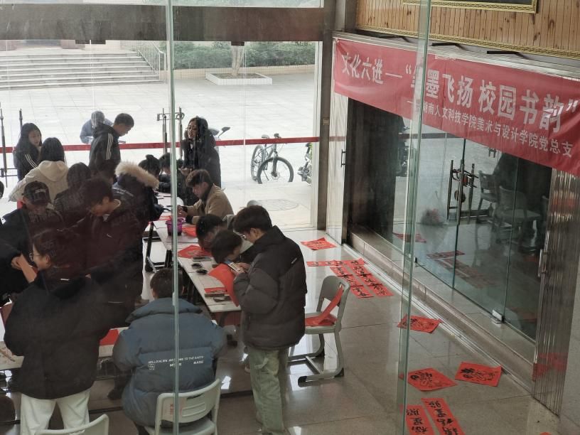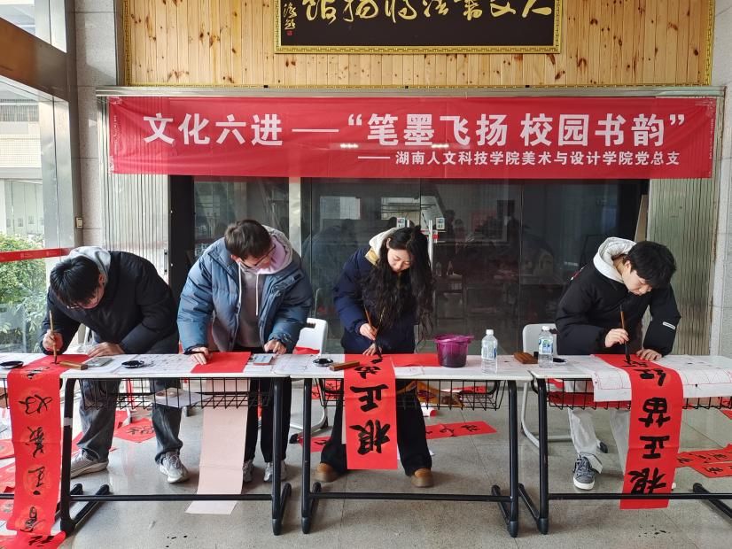 为深入学习贯彻习近平文化思想,传承和弘扬中华优秀传统文化。12月23—25日,美术与设计学院党总支创新党建活动形式,组织书法学专业师生党员开展“文化六进——笔墨飞扬 校园书韵”主题党日活动,先后在南风苑小区、学校食堂、逸夫楼写赠春联。学院党总支书记阳立新、院长陆序彦、党总支副书记黄庆源、教工二支部书记彭建成、专职组织员柳泽伟等一起参与活动。