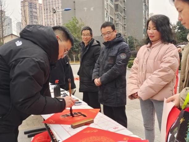 尽管天气严寒,但党员们的创作热情高涨,现场气氛热烈而温馨。他们手持毛笔,神情专注地在红纸上挥毫泼墨,为社区居民书写春联。春联内容既有寓意吉祥的传统佳句,也有紧跟时代步伐的新春寄语,每一副都承载着满满的新年祝福和对美好生活的向往。随着一幅幅春联的完成,党员们马不停蹄地将这些满载祝福的作品送到了社区居民手中。居民们纷纷表示,这样的活动既让他们感受到了传统文化的魅力,又让他们切实体会到了组织的关怀和温暖。
