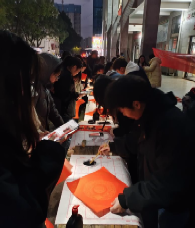 社区过后,活动阵地相继先后转移到了学校食堂和逸夫艺术楼,将写赠春联活动推到高潮。党员们再次拿起毛笔,为大量聚集等待领取春联的学校师生和附近居民,持续一轮又一轮的创作,他们根据不同需求,量身订制了各具特色的春联,既有励志的,也有祝福的,每一副都寄托着对新的一年美好祝愿。