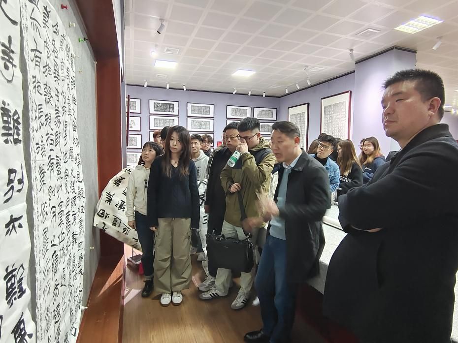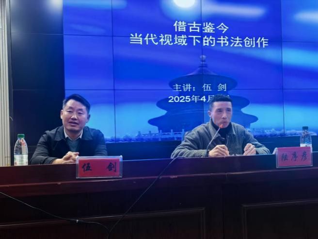 本次讲座主题为《借古鉴今——当代视域下的书法创作》,伍老师首先探讨了中国书法传统与当代创作的融合。他从篆、隶、楷、行、草五体的演变入手,分析了古代经典作品的笔法、章法及精神内涵,并思考如何在现代语境中实现传承与创新。接着,伍老师从文字学、风格史、文化史、人文史、美学史五个角度,系统阐释了书法内涵的真谛。最后,他结合数字化工具、跨媒介艺术等新形式,探索了书法在当代文化中的生命力,强调了“以古为镜”的创作理念,旨在推动书法艺术在新时代的创造性转化与发展。