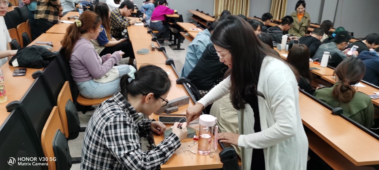 舒女士结合PPT图文对文田砚的发展历程、砚雕的基本知识和基本内容等进行了精要的阐释。之后胡中纲先生运用投影仪亲自操刀演示,舒女士配合解说,学生很快掌握了操作要领,2人为1小组边听边试雕。