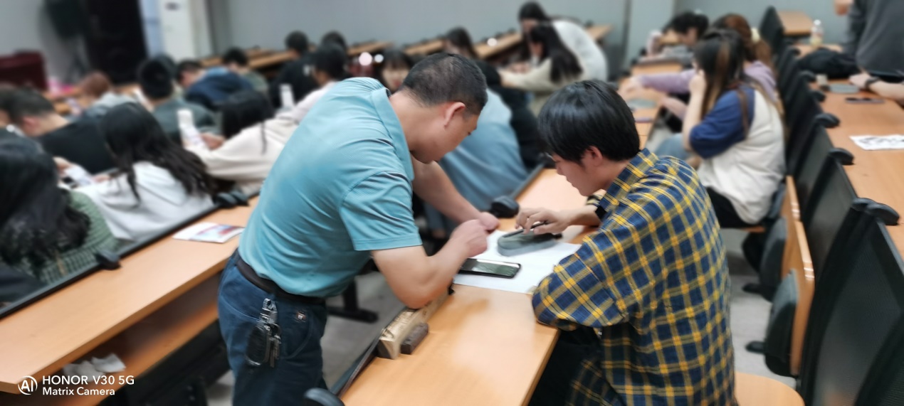 对此次文田砚线下与线上混合式实践教学,许多学生表示收获很大,对艺术创作和就业创业有了新的认识。有的学生还向胡先生表示毕业后想做胡先生的徒弟,之后再返乡创业——开发砚池等文房产品的想法。(文 彭建成/图 钟霖汐)