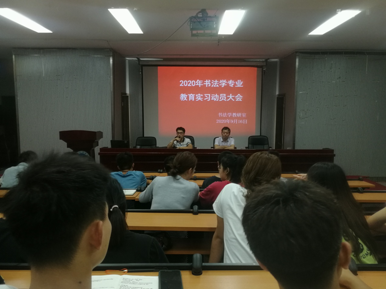 9月16日晚上,书法学专业在美术与设计学院一楼报告厅召开2020年度校企合作暨实习动员大会。书法学专业校企合作带队教师和教育实习指导老师以及书法学专业2017级、2018级、2019级全体学生参加会议,党总支书记谢光绎出席会议并作出指导工作。