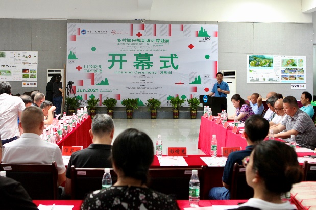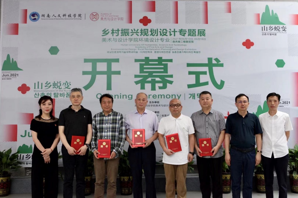 在中国共产党成立100周年前夕、《中华人民共和国乡村振兴促进法》实施之际,6月10日下午,KY官网环境设计专业“2021年 山乡蜕变--乡村振兴规划设计专题展”的开幕式在逸夫美术楼二楼展厅举行,中国建筑学会、湖南省设计艺术家协会、湖南大学、中南林业科技大学、湖南应用技术学院乡村振兴领域专家学者和娄底市科技局、乡村振兴局、邵阳市儒林镇、娄星区双江乡、新化县林业局主要负责同志、湖南人文科学技学院相关职能处室的负责同志参加开幕式和交流活动。