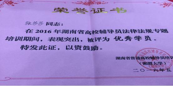 张莎莎参加湖南省高校辅导员专题培训并获优秀