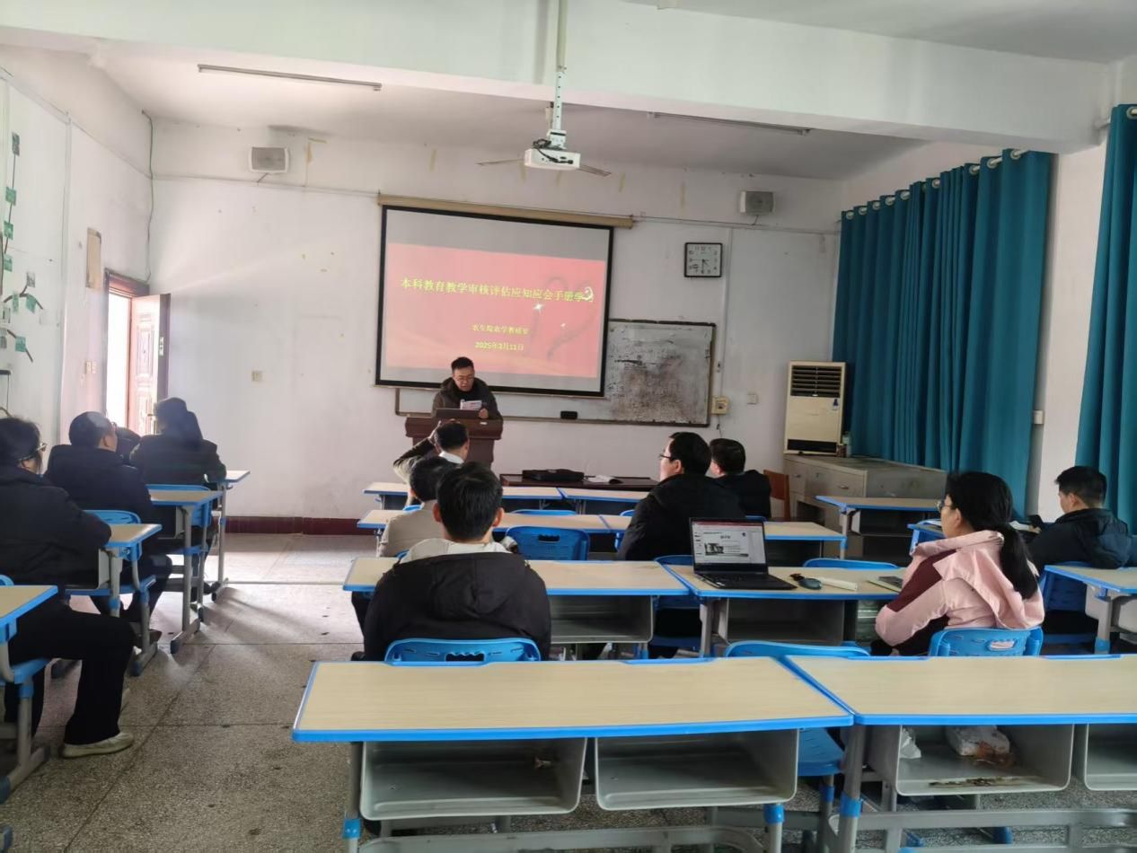 为高质量落实教育部2025年本科教育教学审核评估工作,农学教研室3月11日在强毅楼601室开展专项学习活动。活动由教研室主任刘显军主持,院长向国红,副院长孟桂元全程参与和指导。