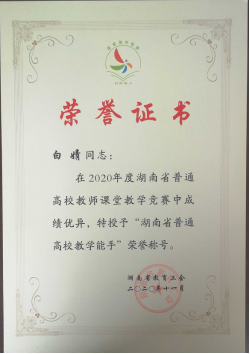 3.师资力量 现有专任教师20人(含兼职老师),其中正高职称人员3人,副高级职称6人,硕士生导师11人,博士10人。现有1个湖南省科技创新团队,1位湖南省普通高校教学能手,1位湖南省“芙蓉学者奖励计划”青年学者,1位湖南省121创新人才工程第三层次创新人才。