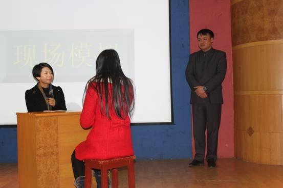 颜斌斌老师首先讲解了招聘礼仪的重要性,引起同学们极大的兴趣,他从社交礼仪对求职的重要性以及对我们生活的影响做了详细的分析,通过现场模拟面试给大家分析了求职应聘需注意的礼仪,同学们认真听讲并做好笔记,遇到不懂的问题,积极踊跃地提问,现场气氛活跃。
