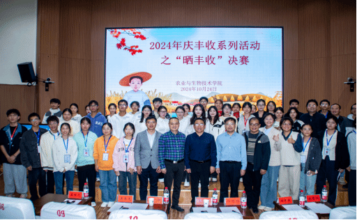 为庆祝2024年中国农民丰收节,弘扬农耕文化,增强学生对自然与农业的认识,10月24日晚,农业与生物技术学院(农科所)在匠成楼报告厅举办庆丰收系列活动之“晒丰收”决赛。本次决赛特别邀请学生工作部、武装部部长曹宇,农生院党总支书记邹坤,院长(所长)向国红,党总支副书记王东光,副院长刘泽发、孟桂元,副院长(副所长)朱赞江担任评委。