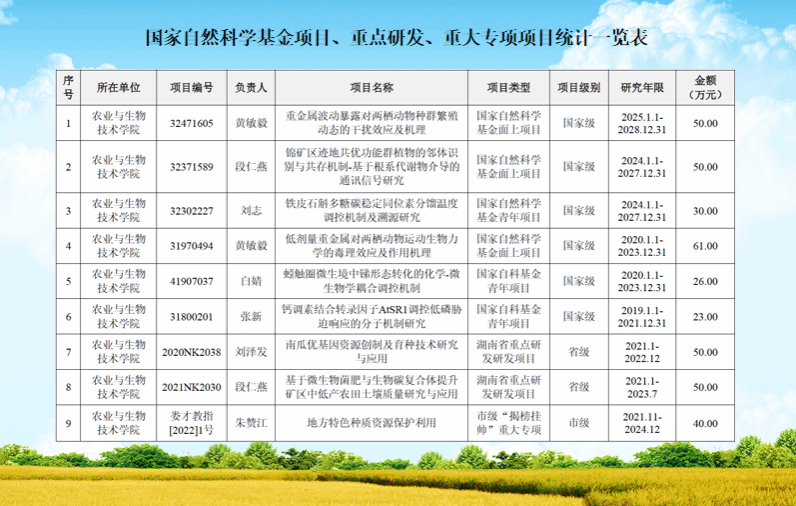 科学研究:2019年以来获省级以上纵向项目120项,其中,国家自然科学基金项目6项,省科技厅重点研发项目2项。获国家级、省级、市级科技成果奖10项,其中,国家科技进步二等奖1项,省科学技术创新团队奖1项,省科技发明一等奖1项,省部级科技进步奖3项,全国农业丰收奖二等奖1项,省农业丰收奖二等奖1项;湖南省教学成果二等奖1项、三等奖2项;选育农作物新品种(组合)1个;获国家发明专利49项;通过省级成果鉴定3项;发表论文444篇,其中SCI收录论文139篇。