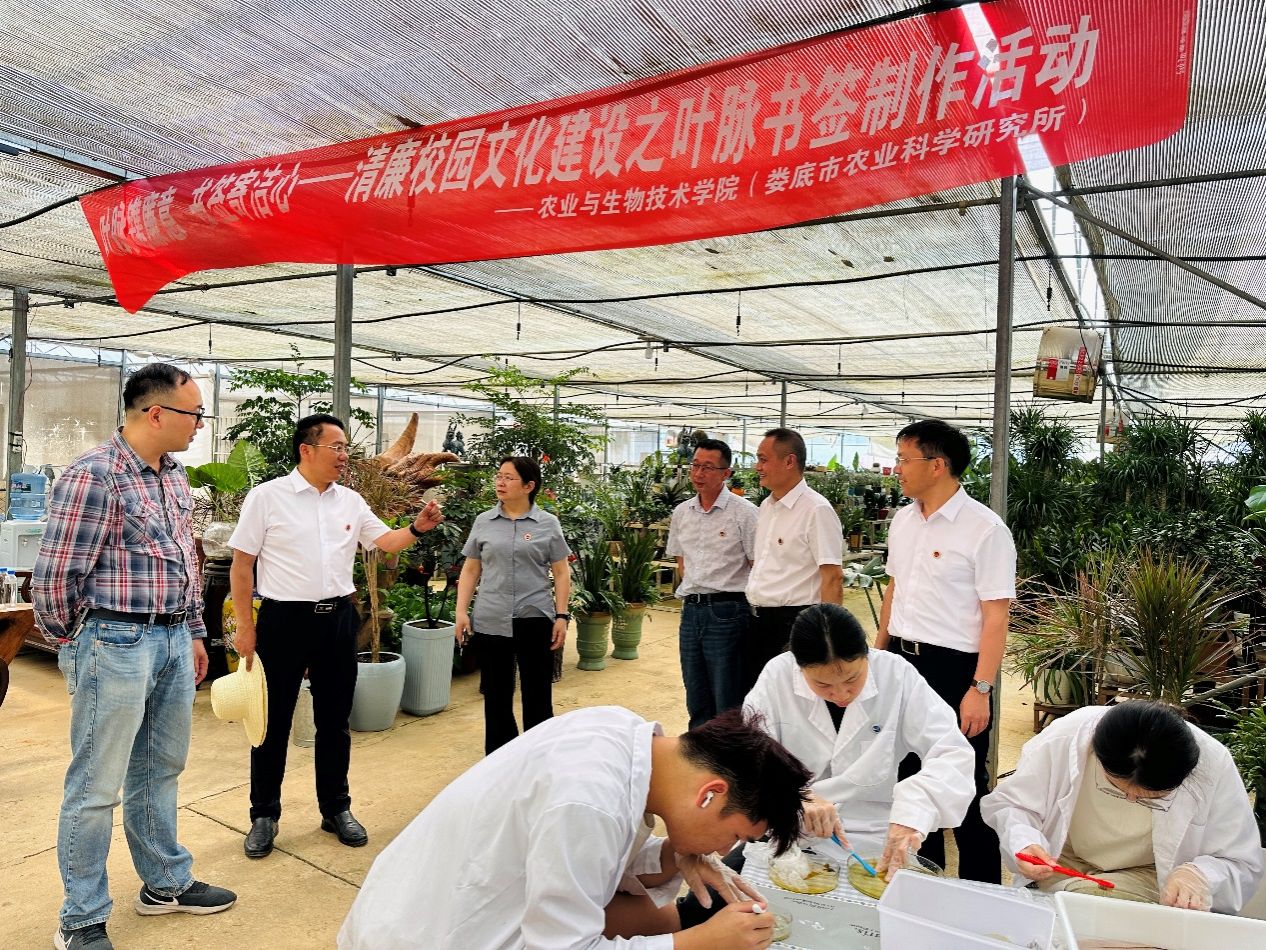 5月13日下午,校党委委员、纪委书记凌艳平赴农生院(农科所)校内基地连栋大棚,实地指导“叶脉镌廉意 书签寄洁心”——清廉校园文化建设之叶脉书签制作主题党日活动,院(所)党总支书记邹坤、院(所)长向国红、副书记王东光等陪同,学生党支部书记、师生党员代表、特殊困难学生代表等30余人参加。