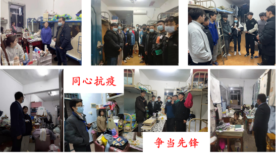 3月22日晚上,院(所)领导带队,支部部分党员老师下寝室宣讲防疫政策,了解学生疫情期间学习和生活中的问题和困难,安抚同学们的心理,鼓励同学们以积极向上的心态共同抗疫,服从学校、学院的管理安排,坚持同心抗疫,静待花开。