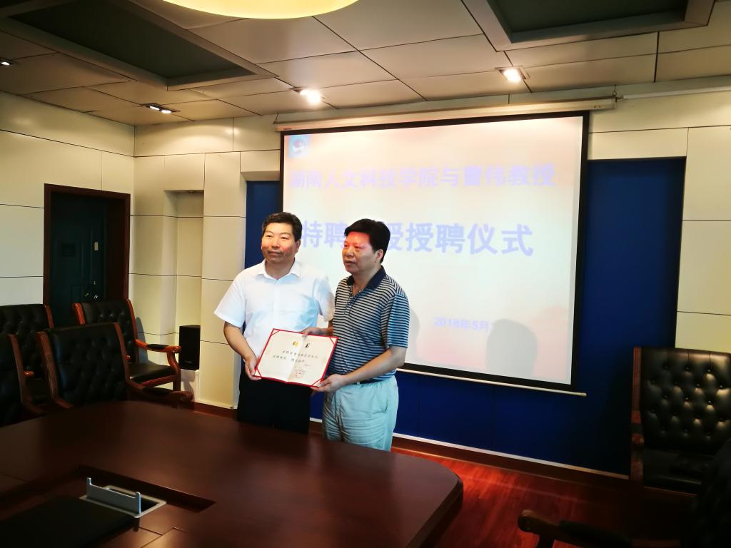 图为刘和云校长为曹伟教授颁发特聘教授聘书。