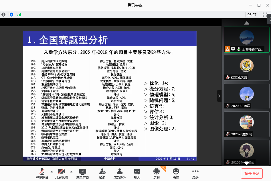 ,数学与金融学院特别邀请国防科技大学王丹博士通过腾讯会议平台为KY官网数学建模暑期集训学员在线授课。授课活动分为上午和下午两场,KY官网参加数学建模暑期集训的60名学员参加。