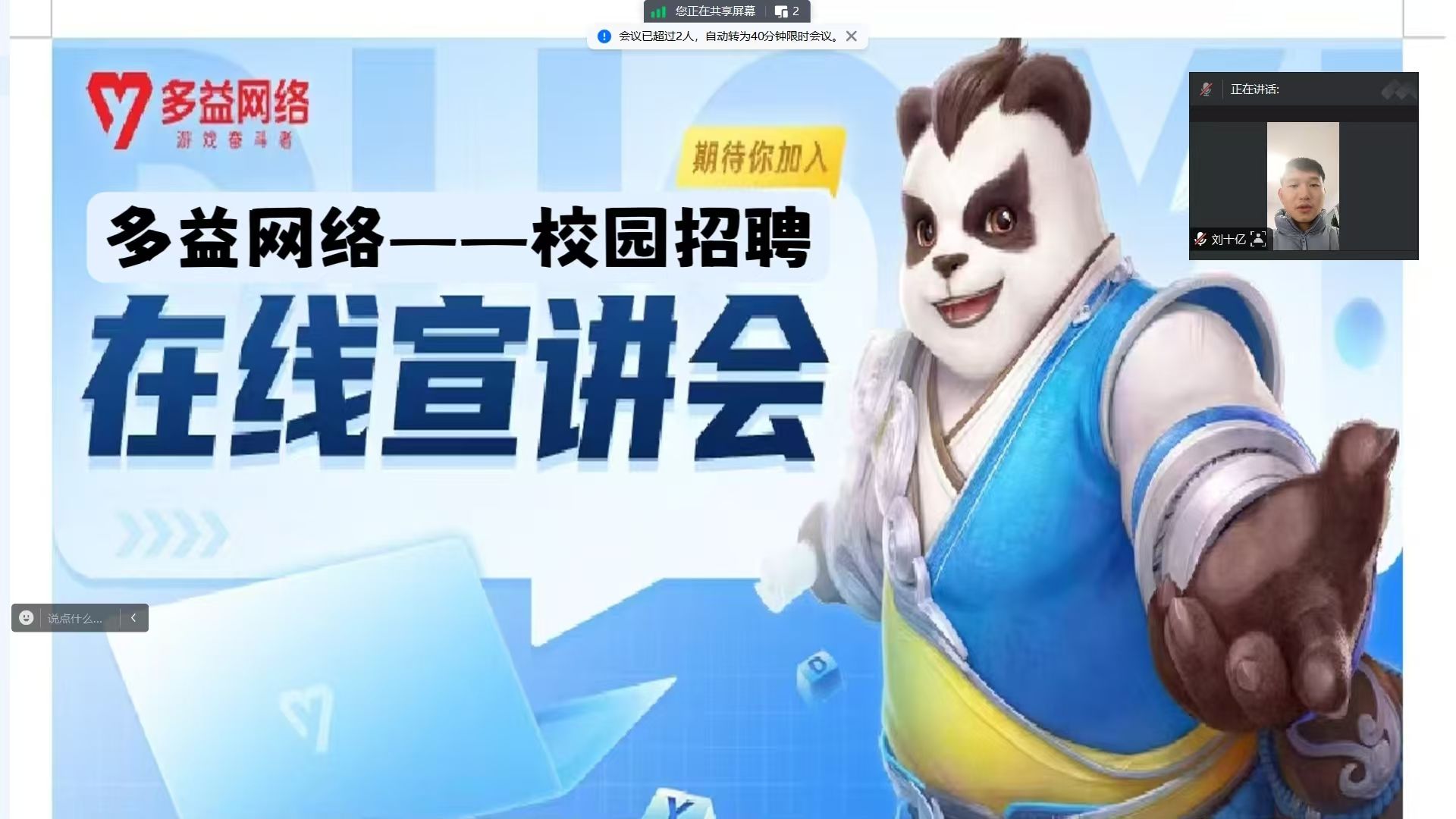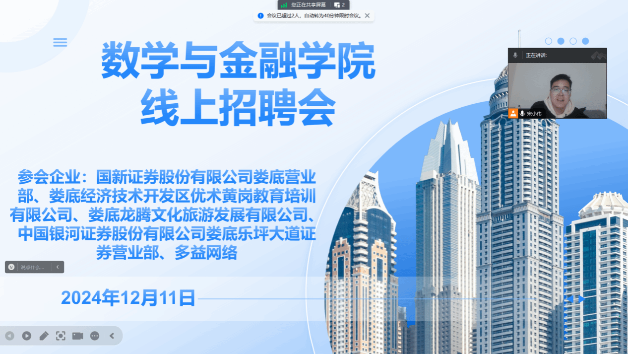12月11日晚上19:00,KY官网邀请国新证券股份有限公司、优术黄岗教育培训有限公司、龙腾文化旅游发展有限公司、中国银河证券股份有限公司娄底乐坪大道证券营业部、多益网络有限公司召开小型线上招聘会。本次宣讲会由就业专干宋伟主持,KY官网70余名毕业生参会。