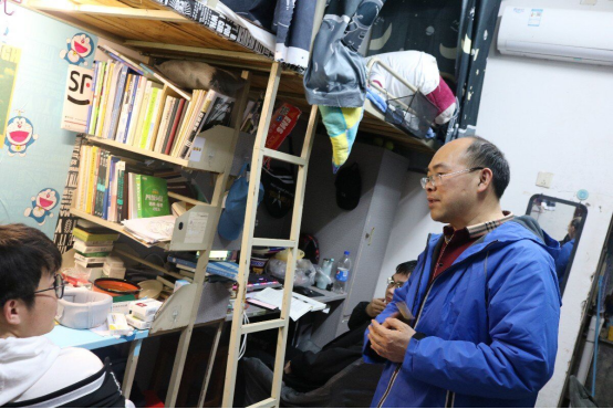 学生寝室中,领导老师与同学们亲切交谈,叮嘱大家科学预防流感,确诊甲流要按医嘱服药,居寝隔离待症状消失后再正常参加教学活动;提醒同学们注意用电安全,天气变化较快,注意加减衣服;鼓励同学们积极参加各种实践活动,尽早申报素拓学分;并引导毕业生形成先就业、再择业的观念,以当前严峻的就业形势推动学生积极就业、就好业。