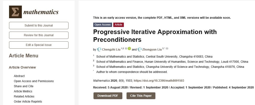 刘成志博士以第一作者在期刊《Mathematics》(中科院SCI三区,IF 1.747 2020年第9期上发表题为《Progressive IterativeApproximation with Preconditioners》的研究论文。论文提出了一种渐进迭代逼近法的预处理方法。由于全正基函数近似病态的配置矩阵使得迭代法的收敛速度较慢,故根据配置矩阵的性质利用对角补偿约化技术构造预处理子,从而得到预处理渐进迭代逼近法,并进行了收敛性分析。数值算例表明,所提出的方法使得迭代法的收敛速度有明显提升。