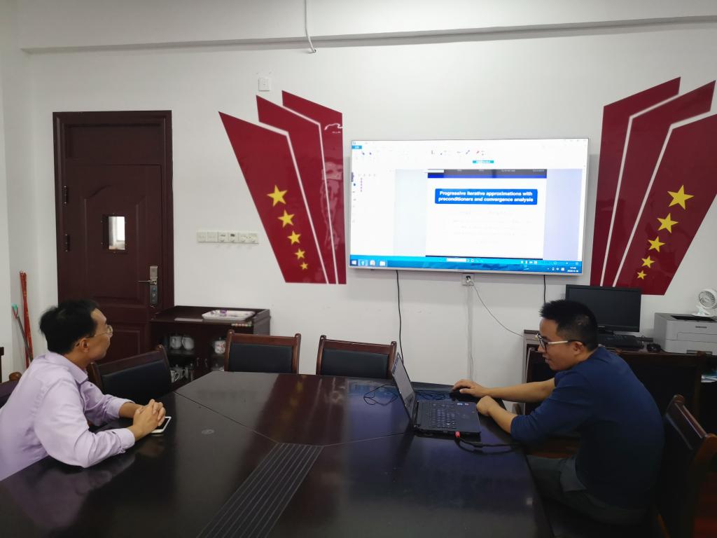 在活动中,首先由团队成员刘成志博士与李军成教授分别作了题为《预处理几何迭代法及其收敛性分析》与《基于控制顶点优化的链接Bézier曲线平滑》的学术报告,然后与会人员分别就两个报告展开了研讨。