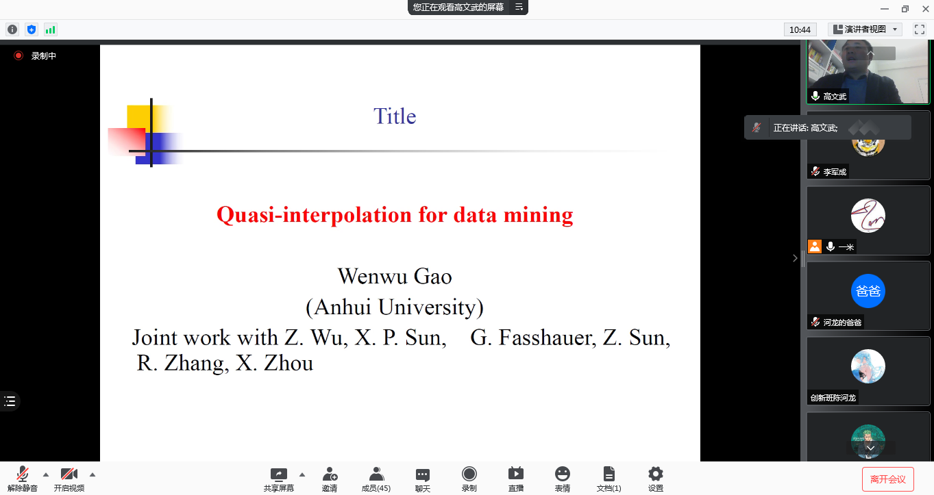 ,安徽大学统计学系博士生导师高文武教授应邀通过腾讯会议平台作了一场题为《Quasi-interpolation fordata mining》的学术报告。本次活动由学院“图形图像中的几何计算与优化”科技创新团队举办,团队成员刘成志博士主持,吸引了来自华南理工大学、中南民族大学、长沙理工大学以及KY官网50余名师生参加。