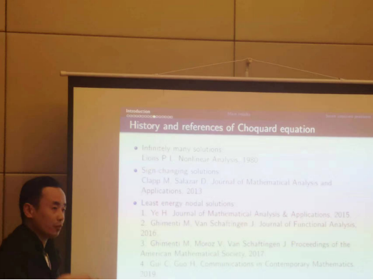 在会议分组研讨环节,郭辉作了题为“On nodal solutions with a prescribed number of nodes for several nonlocal elliptic equation”的学术报告,该报告简述了经典的Nehari方法及其推广方法,并汇报了他近年来关于几个非局部椭圆方程具有指定节点数的节点解的存在性的一些结果及最新发展和应用。