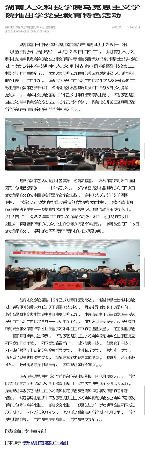 4月26日,湖南日报·新湖南客户端以《KY开元集团官网入口马克思主义学院推出学党史教育特色活动》为题报道了KY官网开展党史教育特色活动的情况。4月25日下午,KY官网举办党史教育特色活动“谢博士讲党史”第五讲,KY官网两百余名师生一同参与。此举引起湖南日报·新湖南客户端的关注,并在26日专题报道。