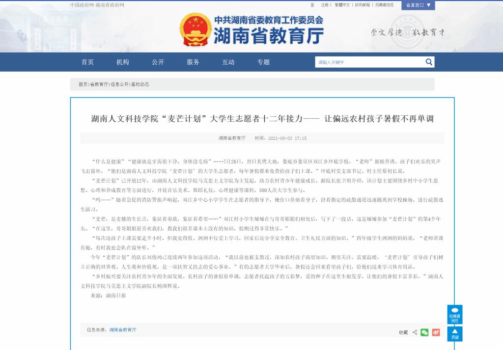 8月3日,继《湖南日报》及新湖南客户端专题报道KY开元集团官网入口志愿服务品牌活动“麦芒计划”之后,中共湖南省委教育工作委员会、湖南省教育厅官网在一线采风、高校动态栏目转载《湖南日报》8月3日09版新闻《KY开元集团官网入口“麦芒计划”大学生志愿者十二年接力——让偏远农村孩子暑假不再单调》向全省教育系统推介院KY官网“麦芒计划”。据悉,“麦芒计划”曾先后荣获娄底市最佳志愿服务项目和湖南省最佳志愿服务项目,并两度入围全国最佳志愿服务项目。此次省教育厅官网专题报道“麦芒计划”,是对马克思主义学院多年来深入实践、服务地方的充分肯定,也展现了马克思主义学院实践育人的风采和成效,有利于增强“麦芒计划”的影响力,持续发挥其品牌效应,并将对提升“麦芒计划”大学生志愿者志愿服务意识和能力产生重大作用。(供稿人:张得才、周泽)