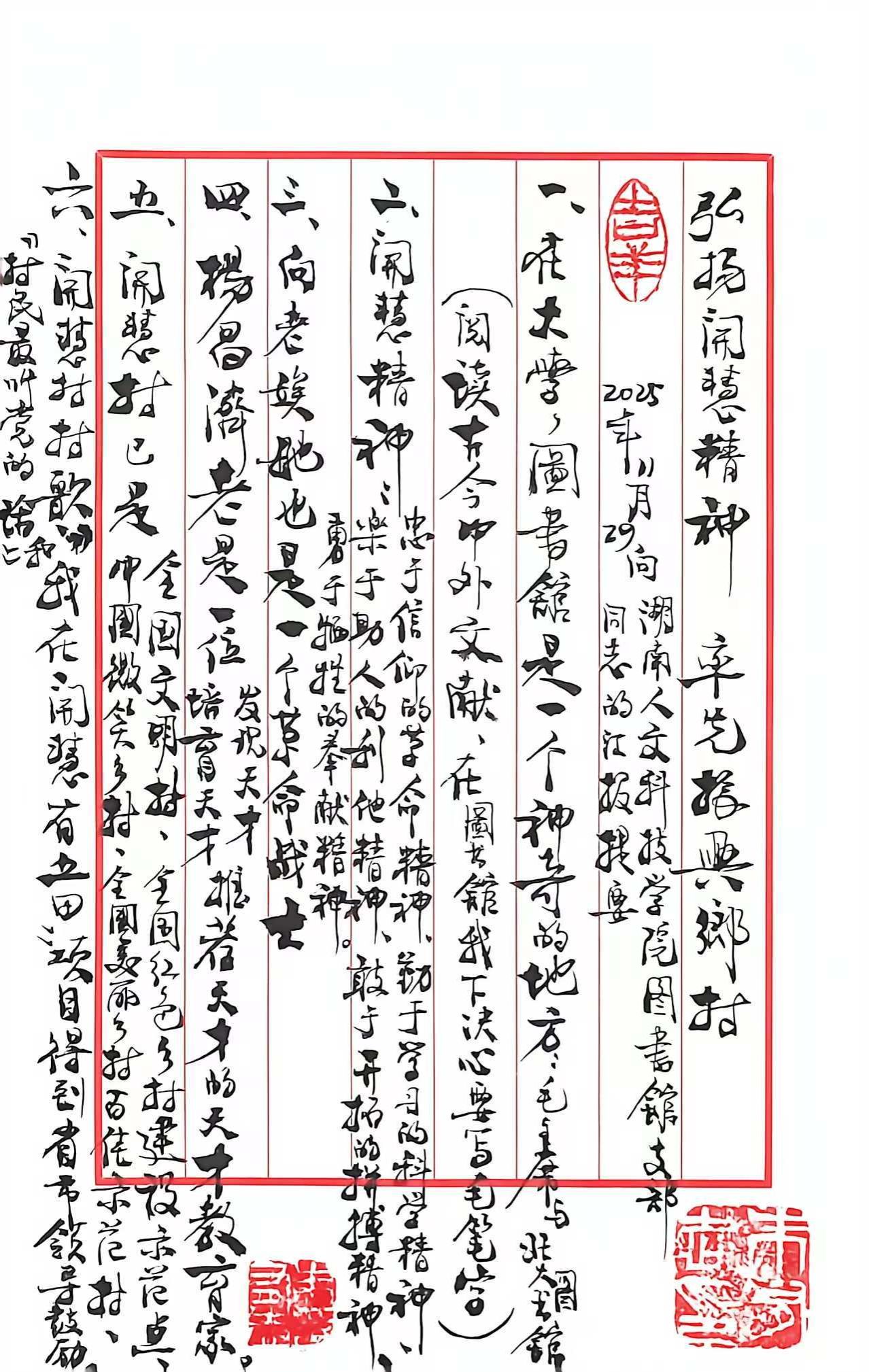 参观结束后,开慧村党支部第一书记朱有志作了题为《弘扬开慧精神,率先振兴乡村》的党课。生动讲述了革命领袖毛泽东主席与图书馆的不解之缘;讲述了开慧村总结提炼的关于开慧精神的五个内涵:忠于信仰的革命精神、勤于学习的科学精神、乐于助人的利他精神、敢于开拓的拼搏精神、勇于牺牲的奉献精神;讲述了教育家杨昌济先生的革命育人情怀;讲述了他以共产党人的情怀,16年如一日扎根开慧村这片红色土地,以党的农业现代化建设创新理念带领乡村振兴致富的经历。课后,朱有志书记为KY官网图书馆捐赠了他的专著《开慧村语》系列图书。