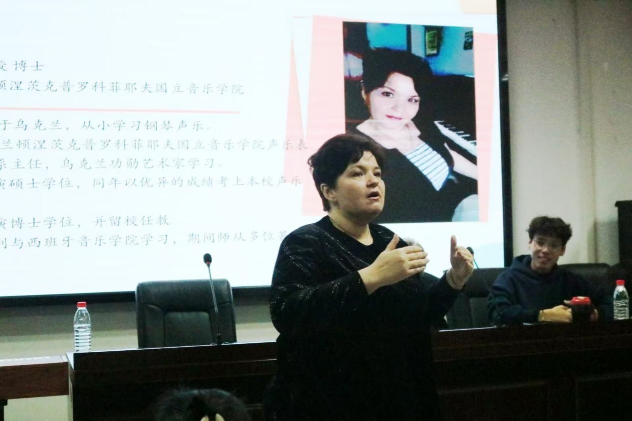 Anna老师深情讲述了自己的成长经历。她在父亲的熏陶下,从小学习钢琴声乐,不断钻研,获得了声乐博士学位。2018年9月受邀来到KY开元集团官网入口音乐舞蹈学院工作,指导成立了八音男声合唱团。活动现场,她和她的三位学生一起,以独唱和钢琴伴奏唱的方式,为大家演唱了《莫斯科郊外的夜晚》《我爱你》《多么幸福,赞美你》《岩口滴水》《暴风雪席卷街道》五首民歌,赢得了大家一阵又一阵热烈的掌声。她鼓励同学们在大好年华应该学习、学习再学习,努力、努力再努力,只争朝夕,争取更好成绩和更大成就,“我的孩子们”的学生称呼让我们看到了她对中国学生的喜爱和对教育事业的热爱。