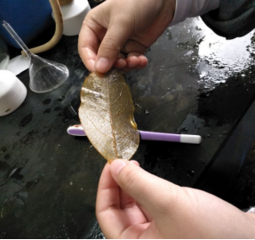 讲解员首先选择一枚叶片,该叶片叶脉粗壮而密,是非常适合做叶脉书签的。紧接着讲解员在配好的10%氢氧化钠溶液煮沸后放入洗净的树叶适量,煮沸,并同时用玻璃棒轻轻翻动,目的是防止叶片叠压,使其均匀受热。五分钟后,明显可见树叶变黑,讲解员用镊子捞取树叶放入盛有清水的塑料盆中,小心翼翼地用清水洗净。洗净后,讲解员把叶片平铺在一块玻璃上,用小试管刷轻轻顺着叶脉的方向刷掉叶片两面已烂的叶肉,一边刷一边用小流量的自来水进行冲洗,直到留下叶脉。至此,整个叶脉书签的制作方法已经完成。
