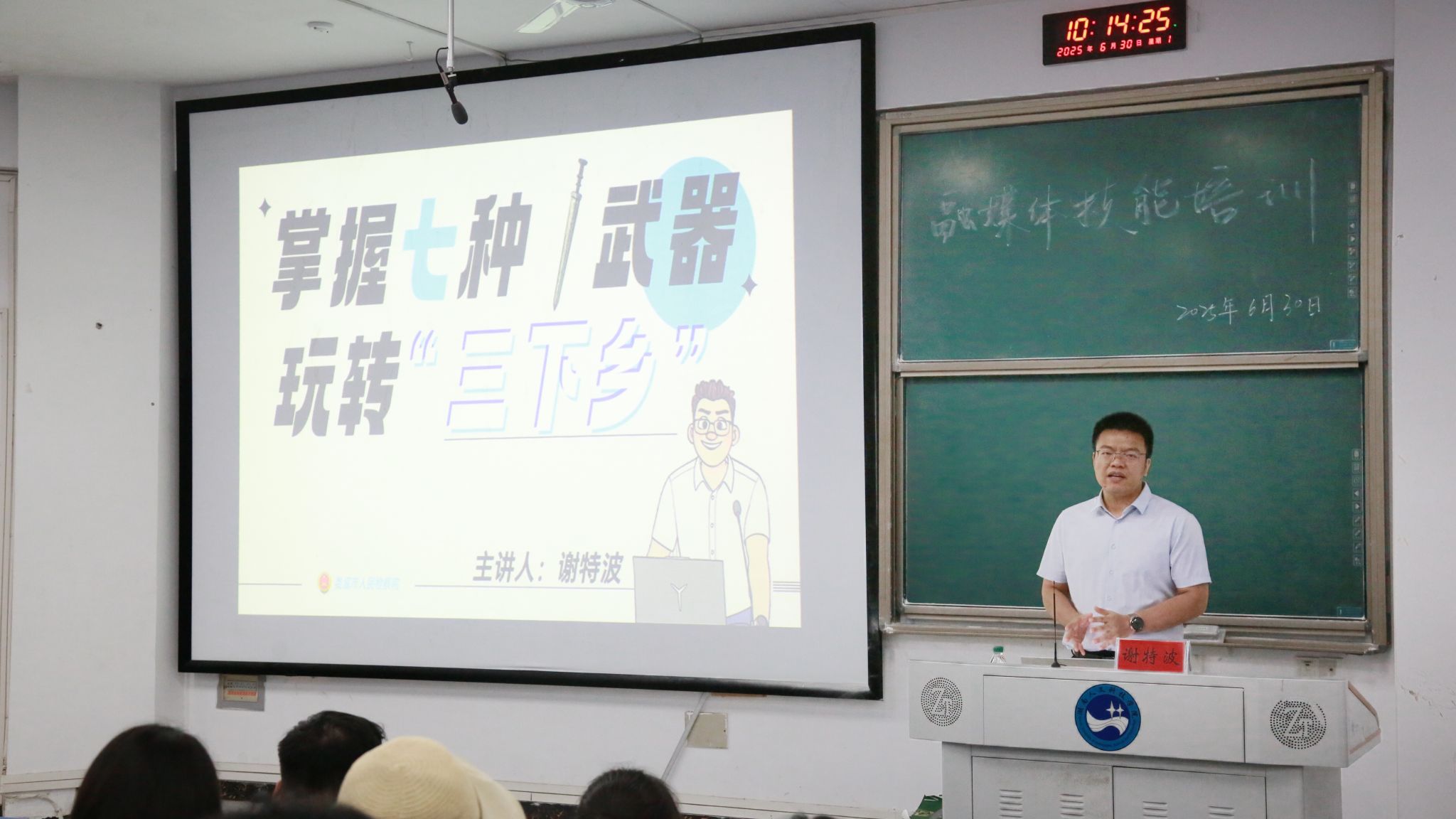 谢特波围绕三个层面展开深度分享:在新闻传播认知层面,他以新媒体时代信息裂变式传播为切入点,分析了湖南怀化晓华姐长期原创主义和“卤鹅哥”从七次创业失败到全网刷屏这两个热点;在实践技巧层面,他拆解出清晰传播心法,用“是什么-为什么-怎么办” 搭叙事骨架,再以“标题与内容、版面与图片、字体与时间” 磨传播质感,将理论具象为可复刻的实操指南”;在创新创意层面,他展示了自己制作的创意视频,通过独特的拍摄手法、剪辑技巧和创意构思,呈现出新颖的内容表达形式,为“三下乡”宣传提供了创新思路和灵感。