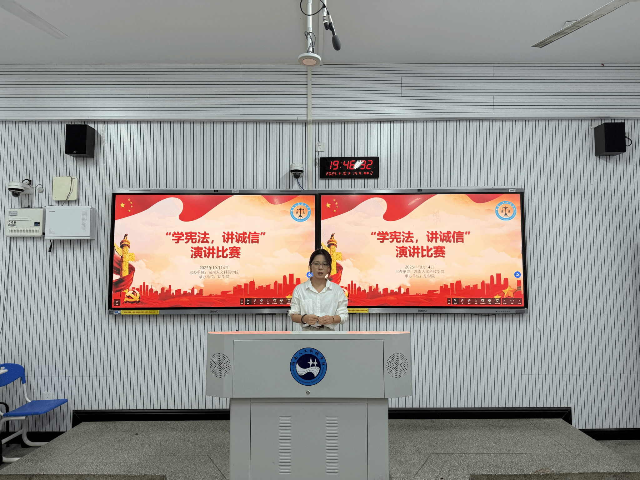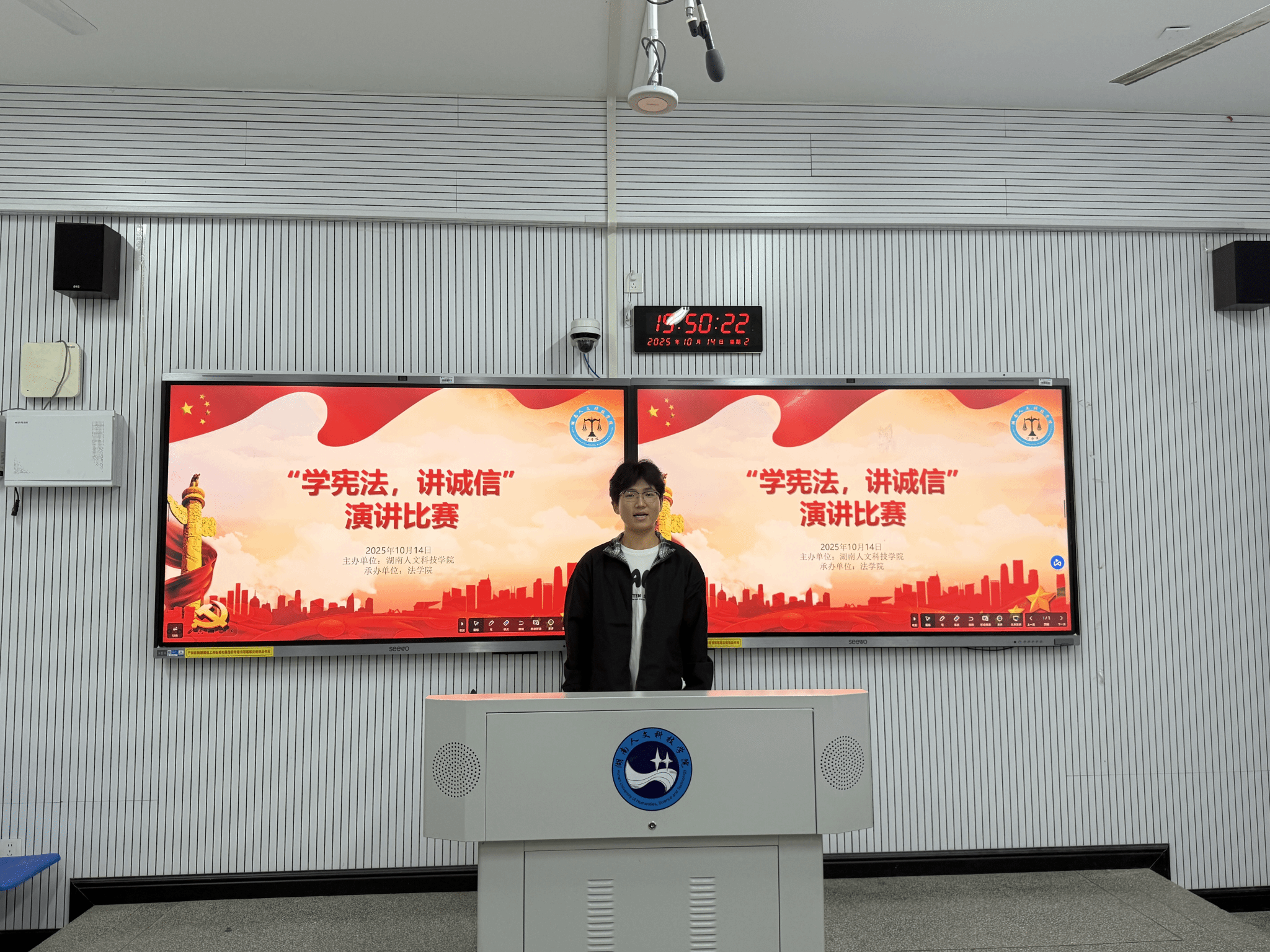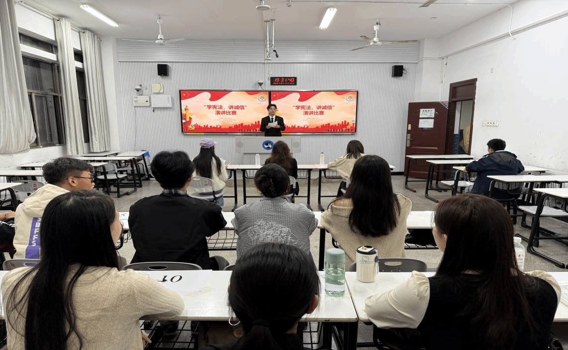 比赛采用即兴演讲形式,流程紧凑有序。每位参赛选手在抽取题目后,有3分钟的准备时间,随后需就“宪法”与“诚信”这一主题展开3至5分钟的即兴演讲。选手们依次上场,结合社会热点、亲身经历与专业知识,从多元角度阐述对宪法权威的认识、对诚信价值的理解,观点鲜明、逻辑清晰,反响良好。