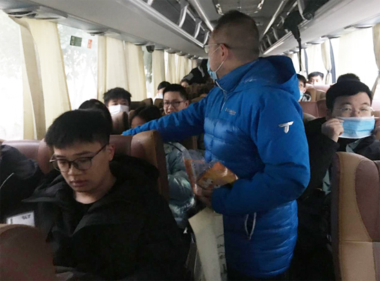 彭辉在车上与考生们亲切交流,为他们加油鼓劲,嘱咐考生们要沉着冷静,预祝同学们取得优异成绩,并为学生们发放暖宝宝等保暖工具,提醒同学们注意防寒保暖。伍铁斌带领教师按照防疫要求严格核验了司机等相关工作人员的健康码和行程码,逐个为同学们测量体温,并提醒考生们佩戴好口罩,注意考场秩序,严格按照疫情防控要求有序参考。陈新为考生们对考生接送相关事项进行了详细安排。学工办辅导员们在送考车旁为考研学子准备爱心姜茶,给寒冷的冬天增添了温暖。学院学生会干部准备了雨伞和雨衣,为考生提供应急服务。