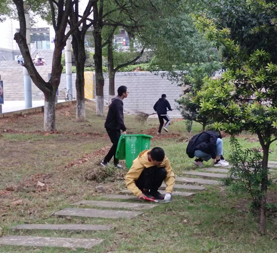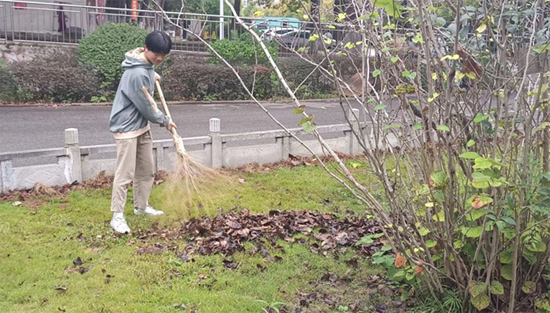 活动当天,气温低且下着绵绵细雨,同学们不但没有懈怠,反而更加积极热情,他们分工明确,互帮互助,一部分人负责捡着落叶、纸屑、烟头、塑料袋等杂物,一部分人负责修剪杂木枯枝,在合作中快速且高效地完成工作。