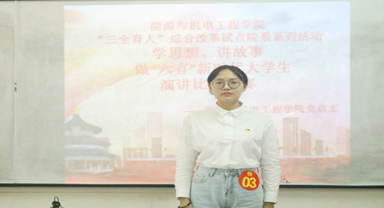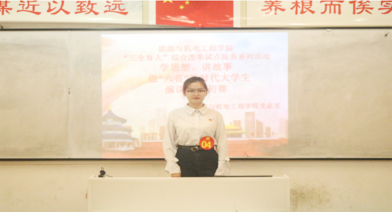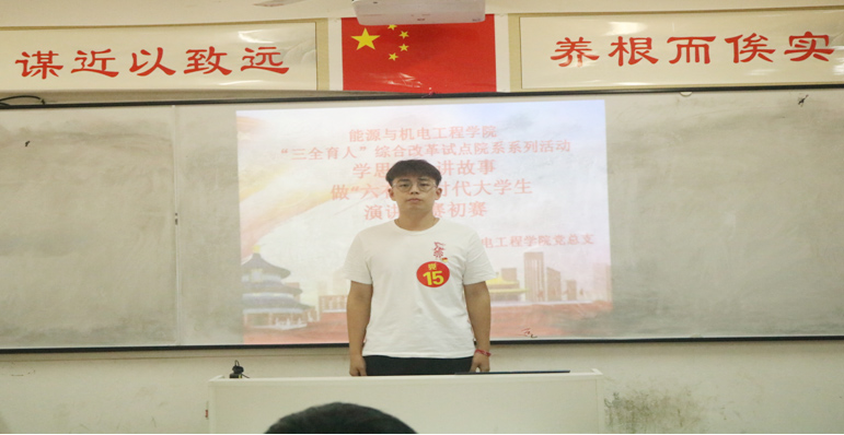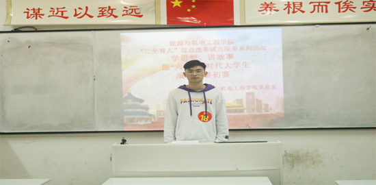 9月初,能源与机电工程学院获列湖南省“三全育人”综合改革试点院系。10月24日,综合改革试点系列活动拉开序幕,“学思想,讲故事,做‘六有’新时代大学生”演讲比赛初赛在同德楼顺利举行。30名党员和47名团员共77名学生参加了比赛。