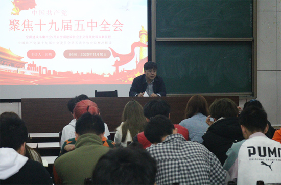 图5 彭辉为学生干部详细讲解党的十九届五中全精神