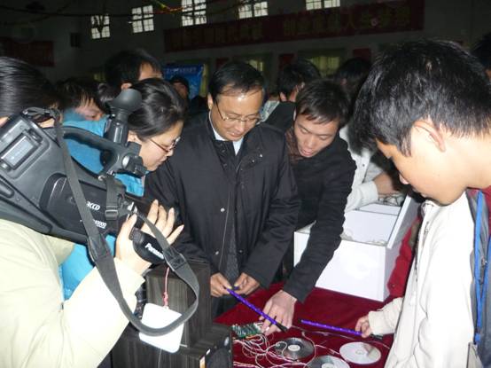 我系展出了“无线环境监测模拟装置”、“简易电子鼓”等参加学院第四届“挑战杯”大学生课外学术科技作品大赛的作品,以及我系参加2009年全国大学生电子设计大赛的部分获奖作品。院领导视察我系展区时,对我系展出的科技作品大为赞赏。