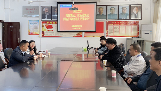 2021年12月2日上午,美的集团家用空调事业部人力资源经理刘华坤、招聘主管肖阳明、校企合作部主管严晓楠,比亚迪集团弗迪科技人力资源部部长王勇等一行来到了能源与机电工程学院就学生实习、就业等相关工作开展洽谈;学校创新创业学院院长刘红燃、就业指导中心副主任奉晓波,能源与机电工程学院院长胡东、学工办主任肖毅等参加了座谈。