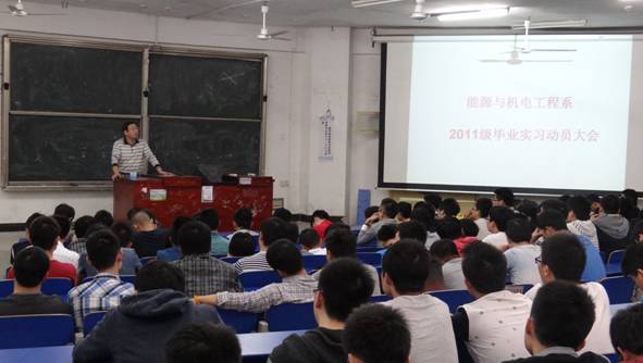 10月23日晚上,能源与机电工程系在致远楼119召开了11级能源与机电工程系毕业实习动员大会。系主任谢常清、系党总支部书记谭甲凡、分管实习工作的副主任张海筹、全系实习带队教师以及毕业班班主任等出席参加了本次大会。