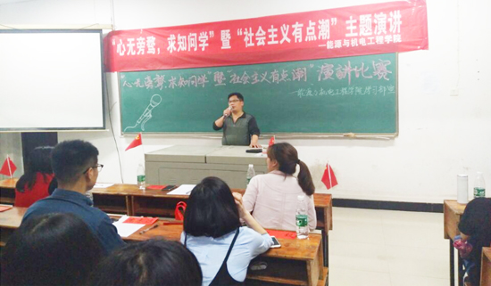 4月18日晚,能源与机电工程学院“心无旁骛,求知问学”暨“社会主义有点潮”主题演讲比赛在学而楼209顺利举行,能机院党总支副书记、辅导员、16名选手及其亲友团共100余名学生参加了此次活动。