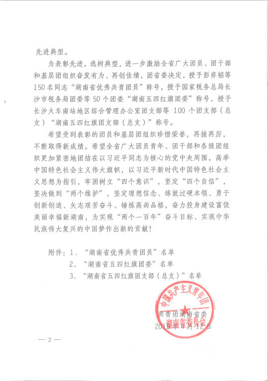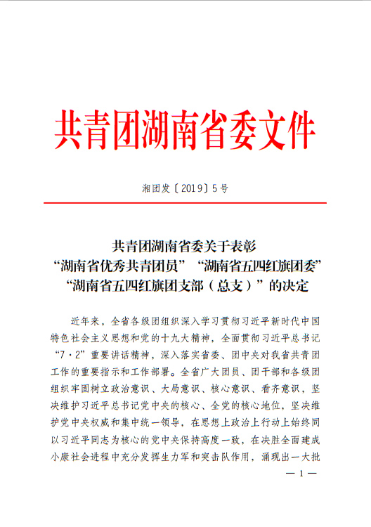 4月12日,共青团湖南省委印发了《关于表彰“湖南省优秀共青团”“湖南省优秀共青团干部”“湖南省五四红旗团委”“湖南省五四红旗团支部(总支)”的决定》(湘团发[2019]5号), 能源与机电工程学院团总支荣获“湖南省五四红旗团总支”称号。